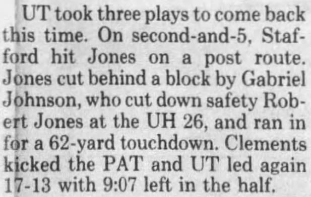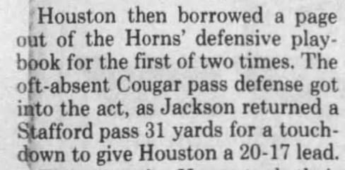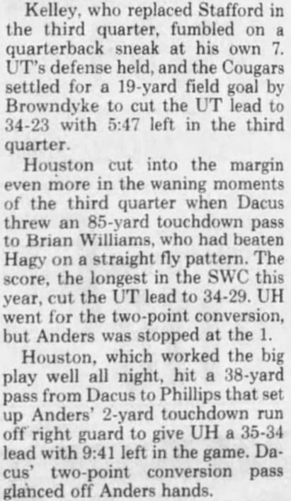 Houston took a 13-10 lead but Texas immediately answered back in three plays with a 62 yard TD pass for a 17-13 lead.