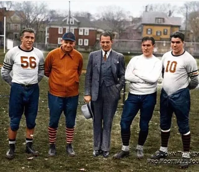 Bill Hewitt, George Halas, Red Grange, Beattie Feathers and Jack Manders at practice (1935)