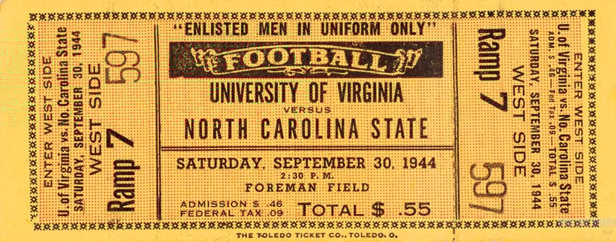Since World War II was ongoing, this game ticket had a special “ENLISTED MEN IN UNIFORM ONLY” printed on it. It makes sense as Norfolk, Virginia, has one of, if not the largest, naval presences in the country. I like to think this game was a special treat for the servicemen. Go see NC State vs. Virginia in full uniform for only 55 cents! What a deal!