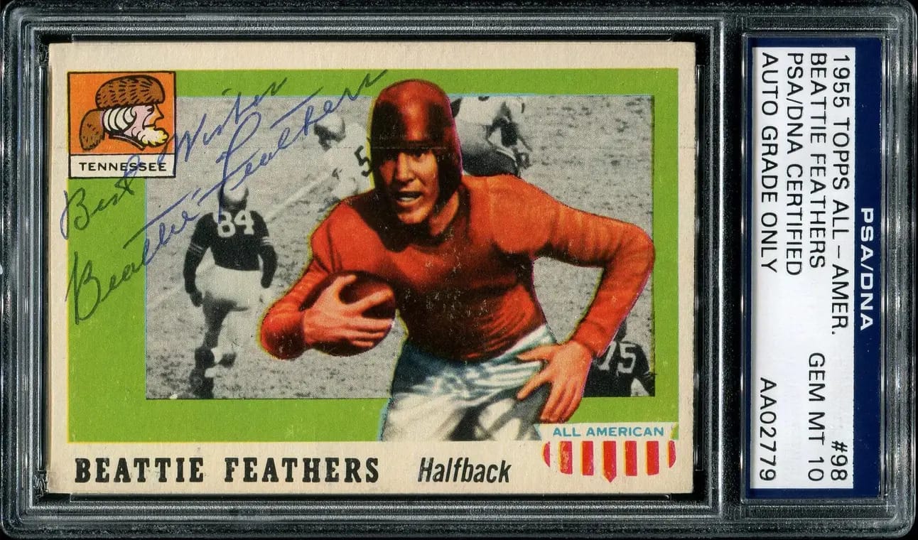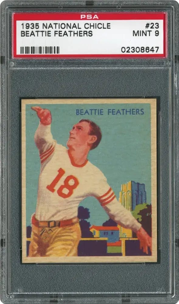 A few more Beattie Feathers facts. His average of 8.44 yards per attempt that same year remains an NFL record (minimum 100 carries). He also, as of 2024, is the only NFL player to have outrun the passing leader in a single season. Apparently he’s not in the NFL Hall of Fame. Feathers is one of ten players named to the National Football League 1930s All-Decade Team who have not been inducted into the Pro Football Hall of Fame. Beattie’s got my support for the Hall of Fame.