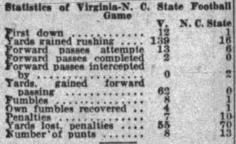 Here is the box score, and let’s break it down a little. NC State had the one unearned first down. Both papers I could find with box scores on the game showed NC State with 16 yards of total offense. The NCAA record book lists this at 10 yards total. I am not sure if we got another game with close yardage. So, I am counting it like the NCAA record books do.