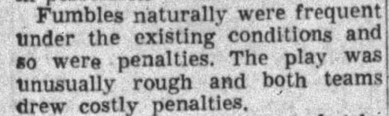 Naturally when you get crazy driving rainstorms you will get some pretty funny writing in the newspaper about the game. This game was no exception. “Fumbles were naturally frequent under the existing conditions.” Exactly, what we like to hear and read about.