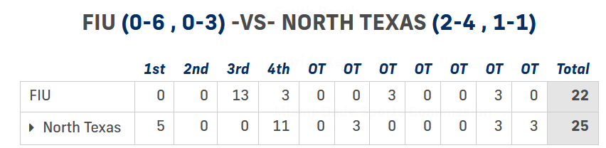 North Texas led 5-0. The rest of the drives in the first half went Punt, Interception, Punt, Punt, Turnover on Downs, Turnover on Downs, Turnover on Downs, where North Texas stuffed FIU on the 1-YARD LINE, then QB Sneak/kneel to make it to halftime.