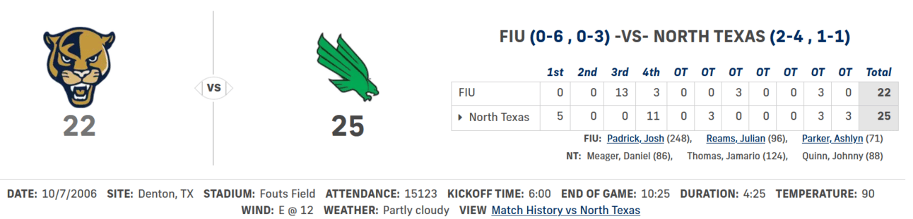 The North Texas Mean Green, sitting at 1-4, welcomed in a Sun Belt Conference rival to Fouts Field. The FIU Panthers limped into Denton, sitting at 0-5 on the season. Yes, I know both of these teams are longer in the Sun Belt Conference. This was classic Fun Belt action, and we would have been all over this game in the Sickos Committee Game of the Week Rankings. If we had a TV channel, this game would run on Sickos Committee Classic too. One issue for getting the game though it was one something called Comcast/Charter Sports Southeast that no longer exists. Alas no video could be found in my cursory search. Maybe Quirky Research finds something.