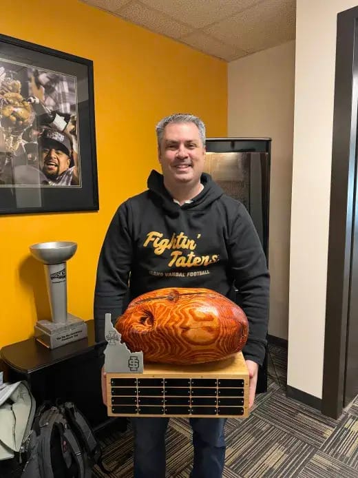 We enter the offices and weight room attached to the building, then head up to Jerek’s office. As we leave to go on a tour of the Idaho basketball arena, I am handed the Potato State Trophy. I got to feel the weight of the now 18.6-pound trophy, and yes, it was Jerek who carved this thing late nights after 9pm, much to the chagrin of his wife.