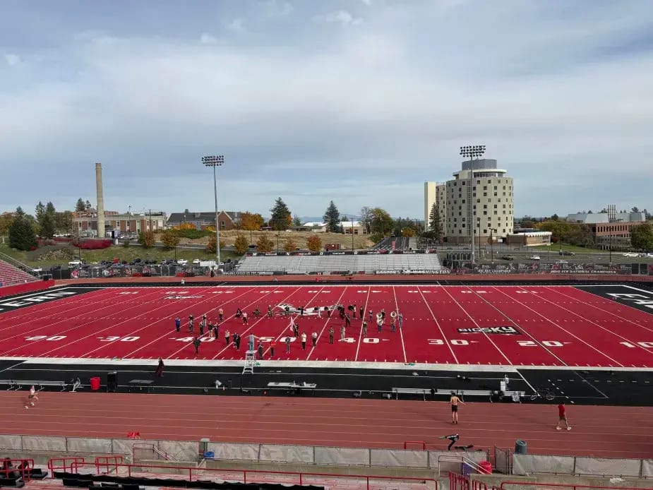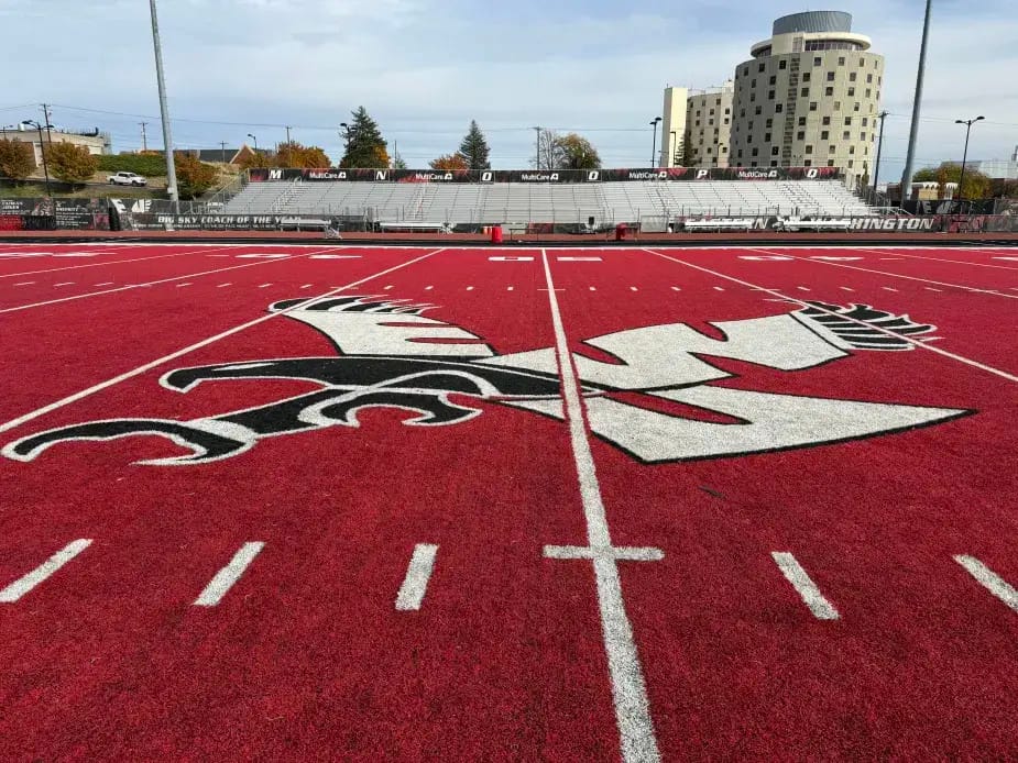 While up here in Spokane, I realized Eastern Washington University was really close to the Spokane airport. Brigit was down to go see THE INFERNO at Roos Field. Like, who wouldn’t want to see red turf field in person? I had emailed the Eastern Washington athletic department to see if we could stop by the field even though they had a road game at Weber State that weekend. They said they would leave the gate open for us, but the band and track team could be out there.