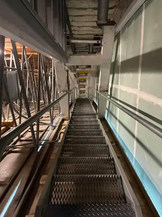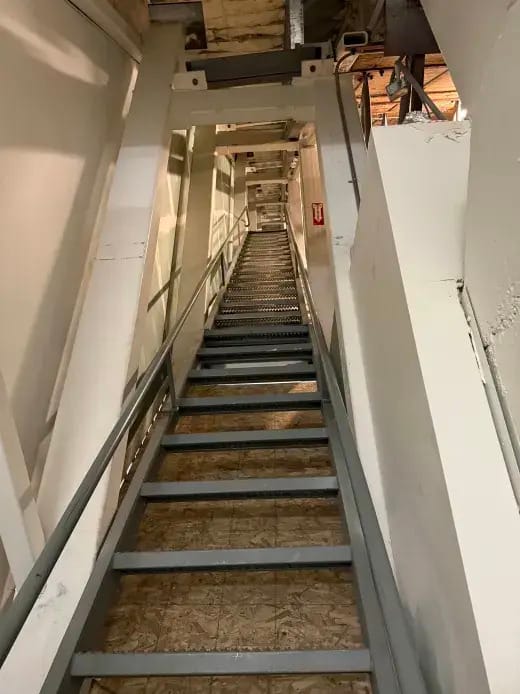 At some point in the proceedings, I made an off the cuff remark about the camera people on the overhangs to Jerek. Then it turned into you want to go up there? Jerek told me this, the stairs were right here and we’d have to climb them to get up there.