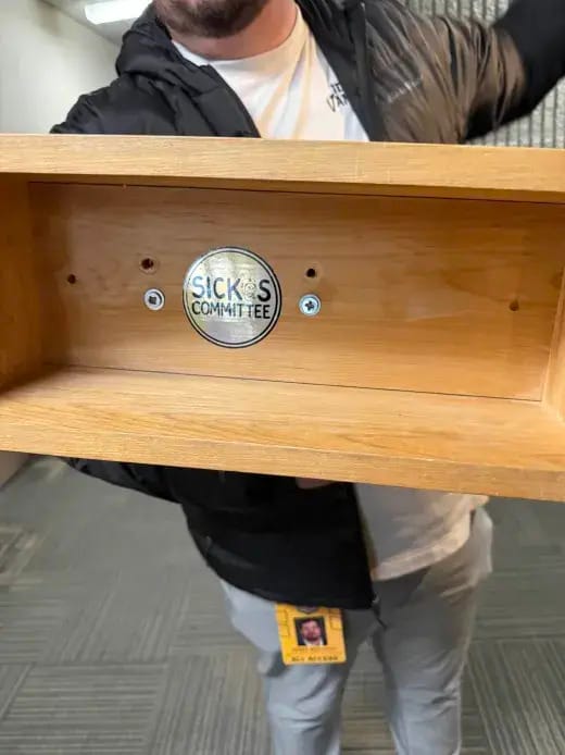 That’s right, a Sickos Committee sticker is underneath and on a College Football rivalry trophy.