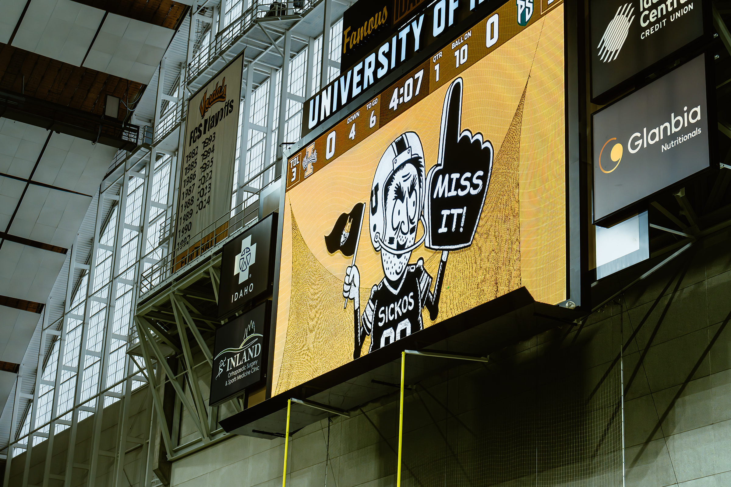 Brigit and I meet all the incredible staff of Idaho athletics, and they say how much they enjoy the things we do on social media. I must say I don’t know how to take a compliment, or I am still in denial people actually like what we do. It’s really weird to hear people enjoy what we do in person, but in a good way. We talk with Eric Anderson, the director of marketing for Idaho. He tells us a secret about a certain nameless social media account he runs. Also, he has a surprise for Brigit and me. Eric tells us that if Portland State scores a touchdown or attempts a field goal going towards the scoreboard, they’d have a special graphic to try to distract the kicker.