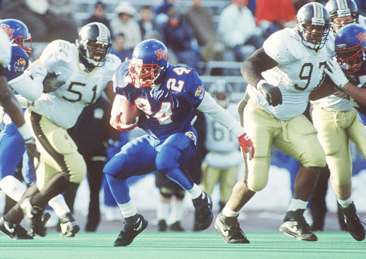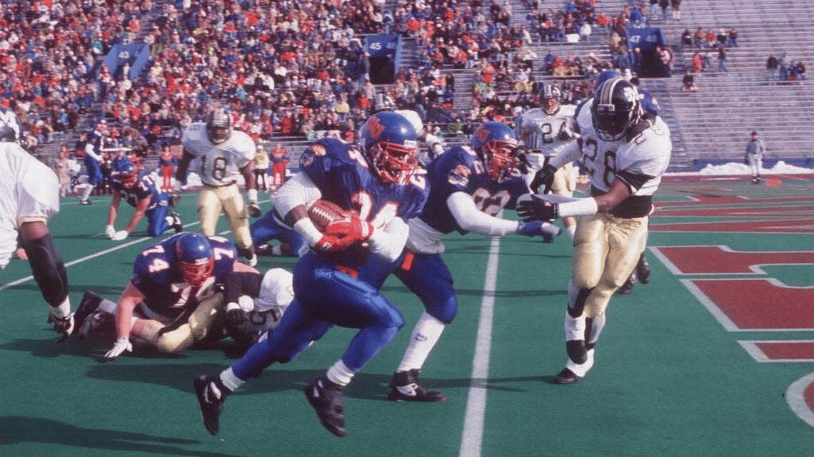 Tony Sands was a running back for Kansas from 1988-1991. He wasn’t really known as a workhorse back as Tony was only 5’6” and 175 pounds. You’d never expect him to haul the ball and grind out a win for Kansas like a 220 or 230 pound back. Throughout his career he averaged about 17 carries per game and only 85.8 yards per game. He was used a bit more in his senior season but still was only averaging about 21.6 carries per game and averaged 104.6 yards per game before his last game as a Kansas Jayhawk.