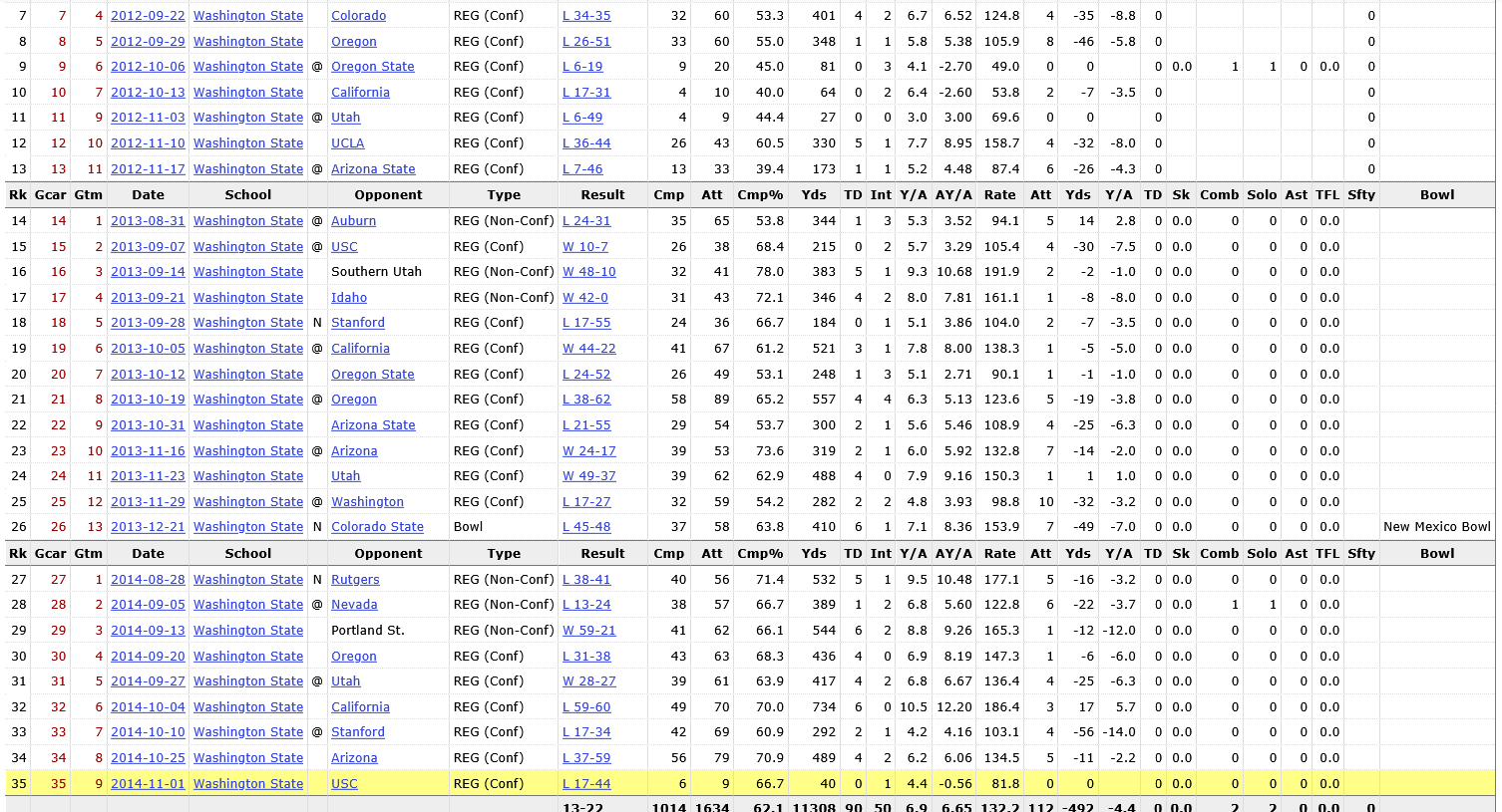 Let’s see a quarterback in Mike Leach’s Air Raid system. Maybe you could see this one coming for Connor Halliday. He was regularly attempting 55-60 pass attempts per game.