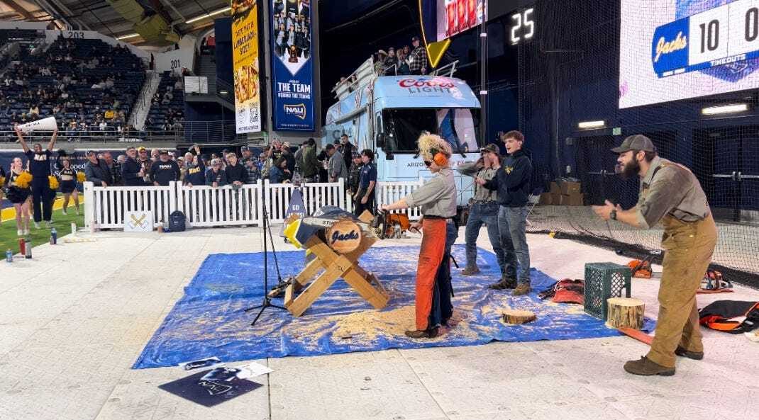 I’m really just waiting for the log to be cut. Let’s get the first cut out of the way. NAU gets a field goal to go up 3-0. Then they get a touchdown to go up 9-0. The small gathering of media comes to the log location after the 5 yard TD run.