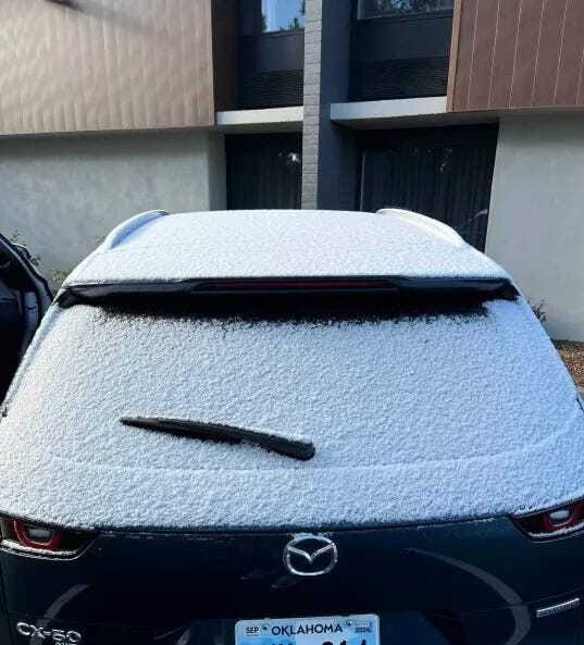 The rental Mazda has snow and yes I did get one with Oklahoma plates while I was in Arizona. Did I make a broad gesture to swipe the light dusting of snow off my vehicle? Yes. Did it work? No.