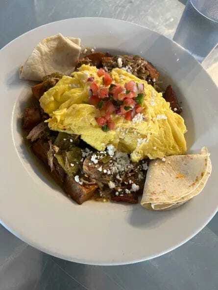 I head into downtown to get breakfast at Tourist Home Cafe and get some cold brew along with some Pork Green Chile & Eggs.