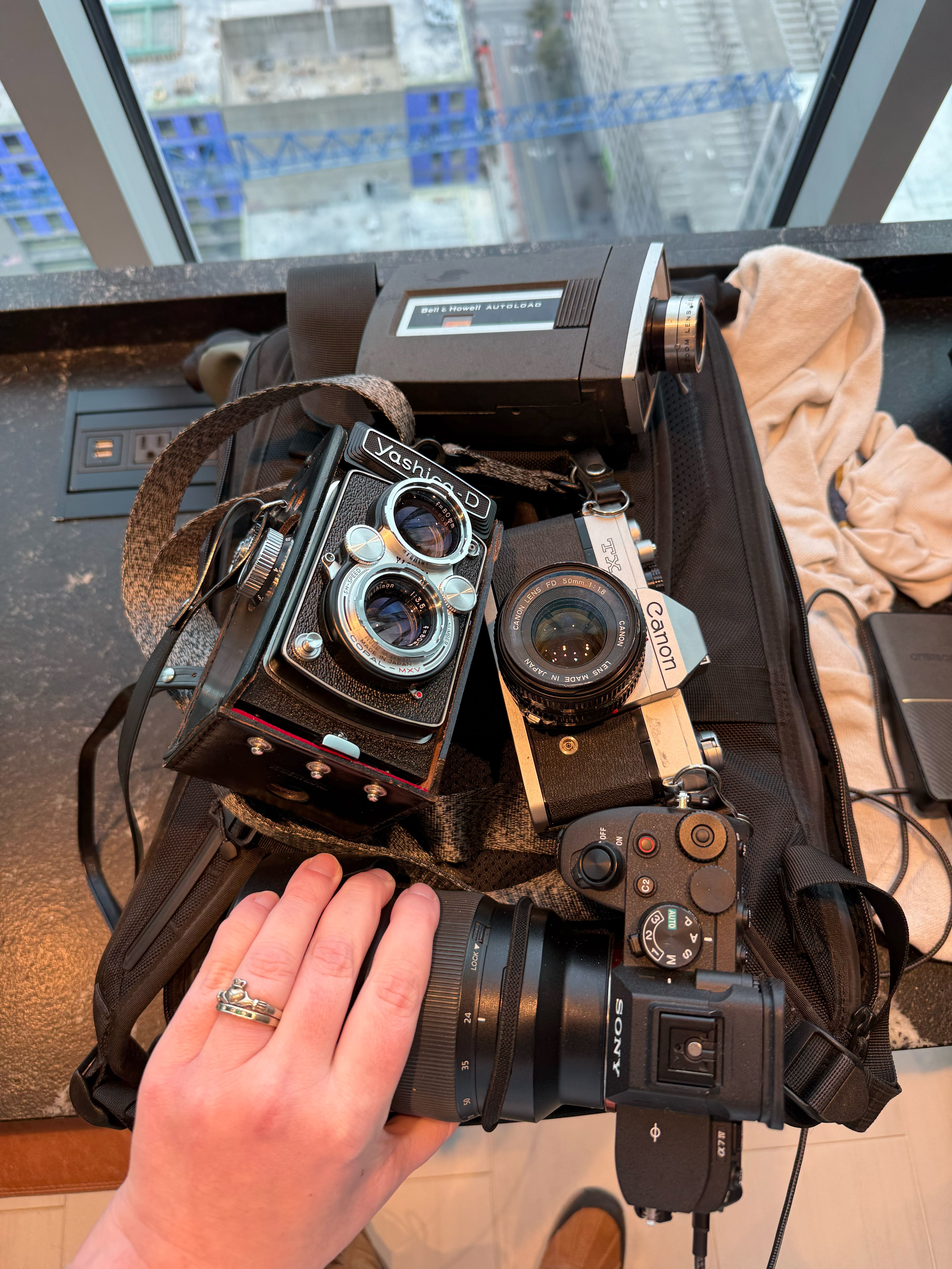All four of the cameras I shot on that day: two digital (Sony a7iv), one 35mm film (Canon TX), one Super 8 (Canon 1014)