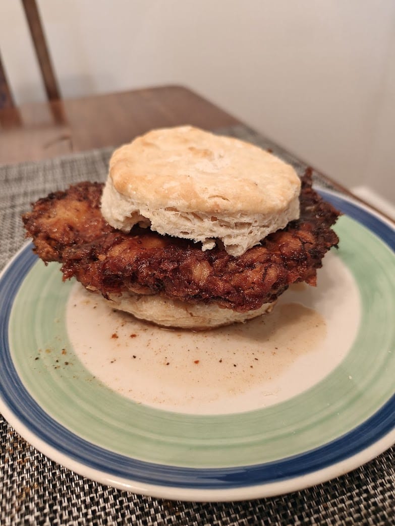 I don’t live in the territory, but one of my favorite things about flying through the Charlotte airport is being able to stop at Bojangles for a chicken biscuit. I wanted to take that delicious sandwich and find a way to incorporate the state of Texas (Texas two weeks in a row?). Yeah, that’s just how it works out…). So I decided to use a chicken-fried steak.
