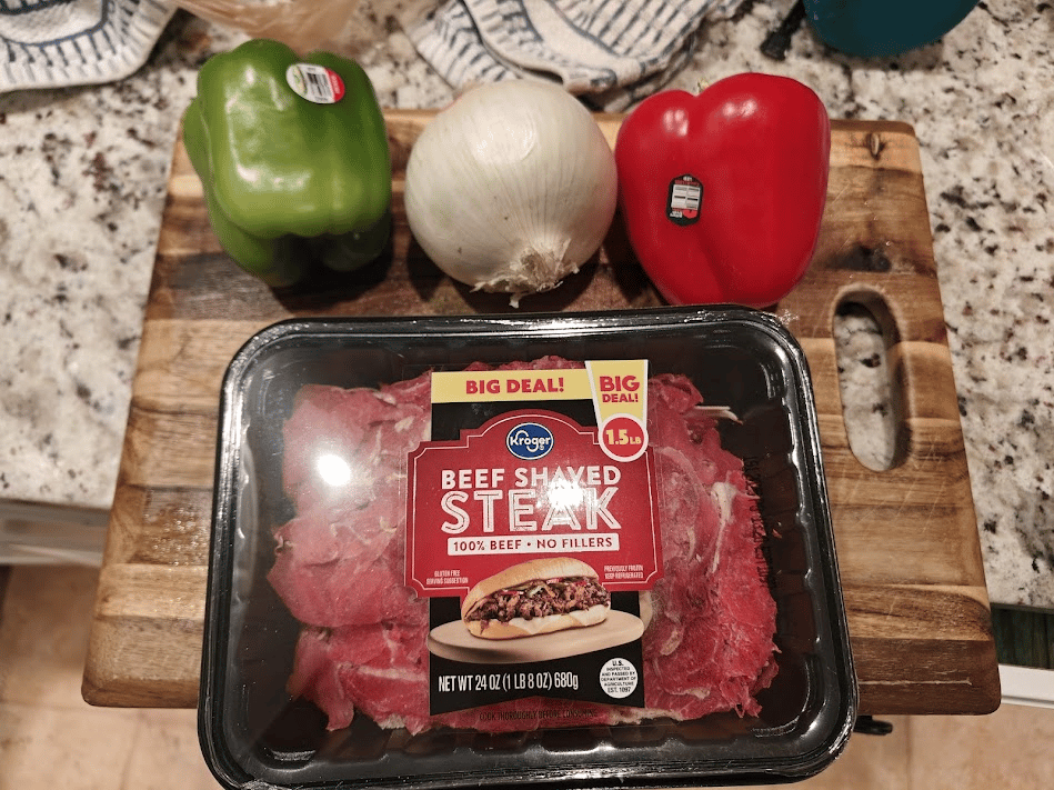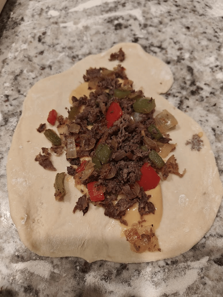 This is where you get the opportunity to go off vibes and make it our own. For my Philly cheesesteak filling, I decided to keep it classic with bell peppers, onions, and thinly shaved steak. No need to mess with classic perfection today.