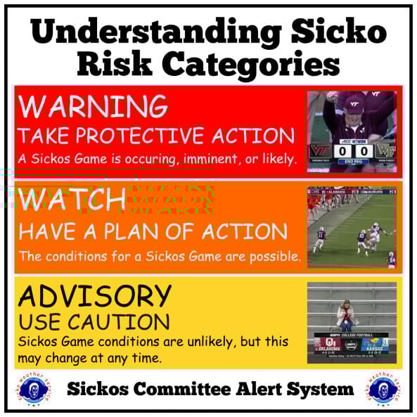 Basically, we’re going to try to assess the team as a Sickos Warning, Watch or Advisory, give you their record last year, provide a little blurb about the team and interesting schedule tidbits. This year we’re also adding a conference specific thing.