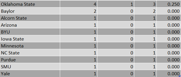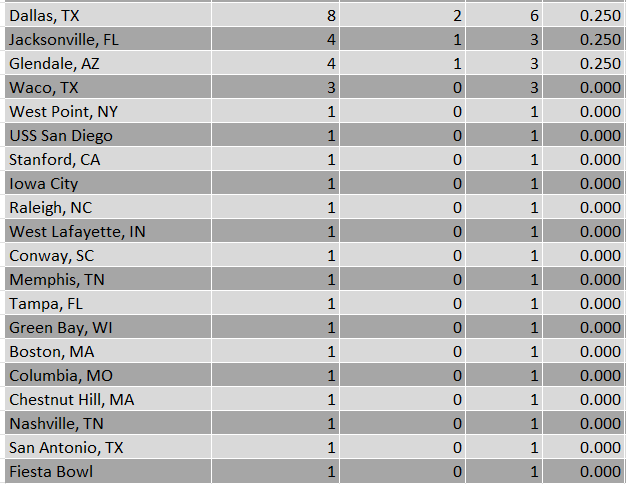 Riding those two Baylor losses, Waco comes in as Corso’s least successful location as well, with an 0-3 record overall. Other noteworthy locations include that time we put X and X on an aircraft carrier, and Dallas, because no one should be expected to accurately predict Red River year in and year out.