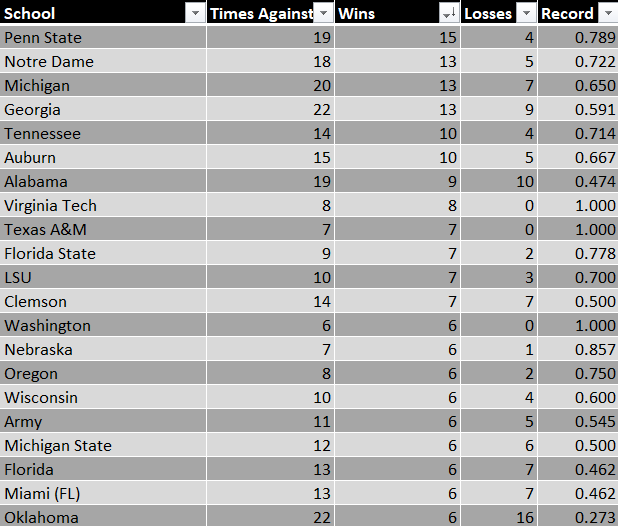 Did I, the Lord of the Spreadsheets Kevin, sort this one differently than the others just to highlight he’s picked Penn State to lose nineteen times and hit on almost 80% of them? Who’s to say, but look at those perfect records picking the Hokies, Aggies, and Huskies to lose.