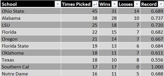 And he’s generally successful picking them too, with only Texas and Oklahoma falling below his overall record of .664. But one school stands out. Lee Corso is a perfect 17 for 17 picking the USC Trojans. Which begs the question: who are his most successful programs?