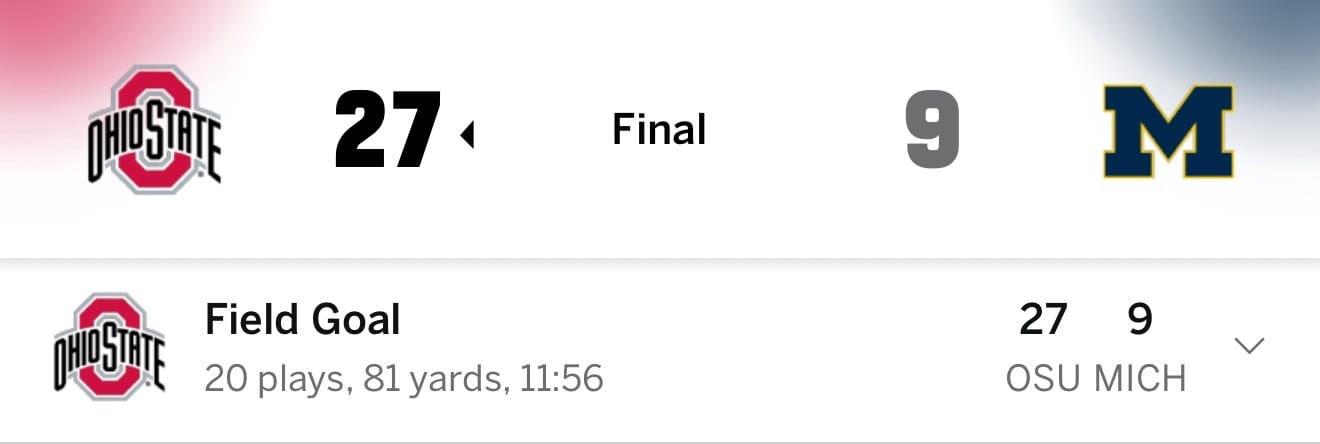 This had to be the most cathartic drive for fans of this team. You have lost to your rival four straight times and you desperately want to end that streak. So you decide to embark on completely demoralizing journey to suck the life out of your rival and their stadium full of fans. This 20 play, 81 yard drive for a 23 yard field goal took 11 minutes and 56 seconds and completely took the life out of the Big House. It is really weird to give an award to the #1 ranked team in the country, but congrats Ohio State??!!!