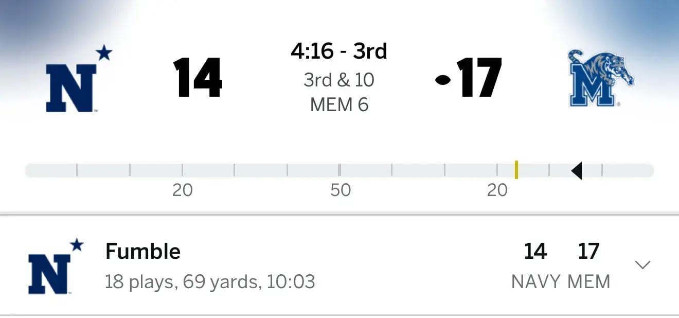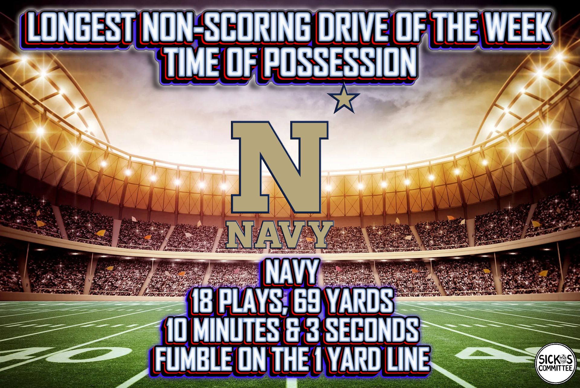 Ok, we need to set this back to the normal committee calibration. Navy was down to Memphis, but they started rolling in the second half. However, they had a little hiccup here with a fumble on the goal line. They still managed to win the game 28-17 with more long drives, but none longer than this 18-play, 69 yard drive that took 10 minutes and three seconds.