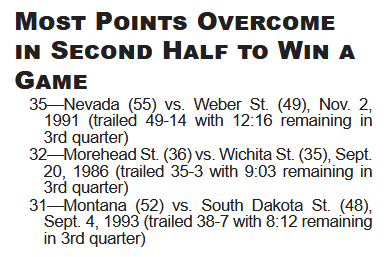 I tried to put this in the perspective of the record books in FCS. Yale’s second half comeback was one of the largest in FCS history. Coming back from 28 down was only eclipsed by these three games in the record books. Sure, there could be more, but I couldn’t find them listed.