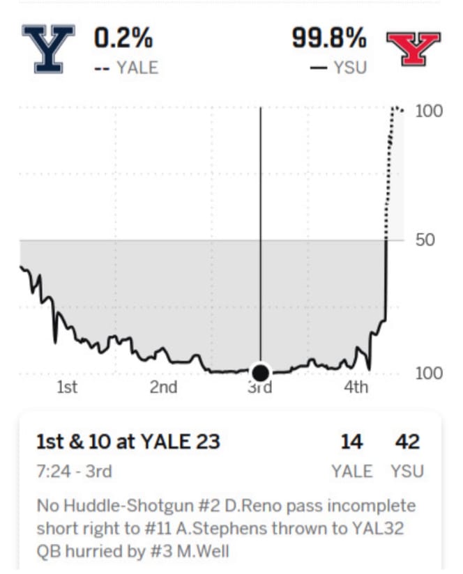 Last but not least, I had to talk about the comeback of the week for Yale. The Ivy League was in their first FCS Playoff experience this weekend. It was not going well for Harvard and Yale. For Harvard, it ended in a 52-7 defeat. But Yale had other ideas. They were down 42-14, and their win probability was at a low of 0.2% after Youngstown State took the lead with 7:37 left in the 3rd, 42-14. Yale did not give up and got a TD and then a two-point conversion to make it 42-22, then rattled off three touchdowns in the 4th to complete an historic comeback.