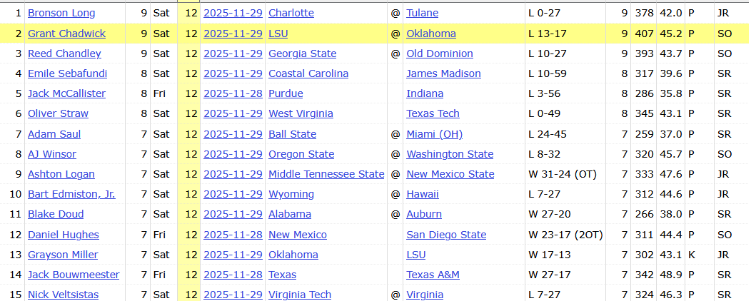 Also, we had so many hard working punters this week. We had three punters with 9 punts but here are 15 punters who booted the ball at least 7 times this week in FBS.
