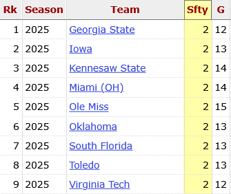 Georgia State had back to back games with Safeties early in the year. You know Iowa would wind up here every year like normal. Oklahoma forced a safety to seal a win over Auburn.