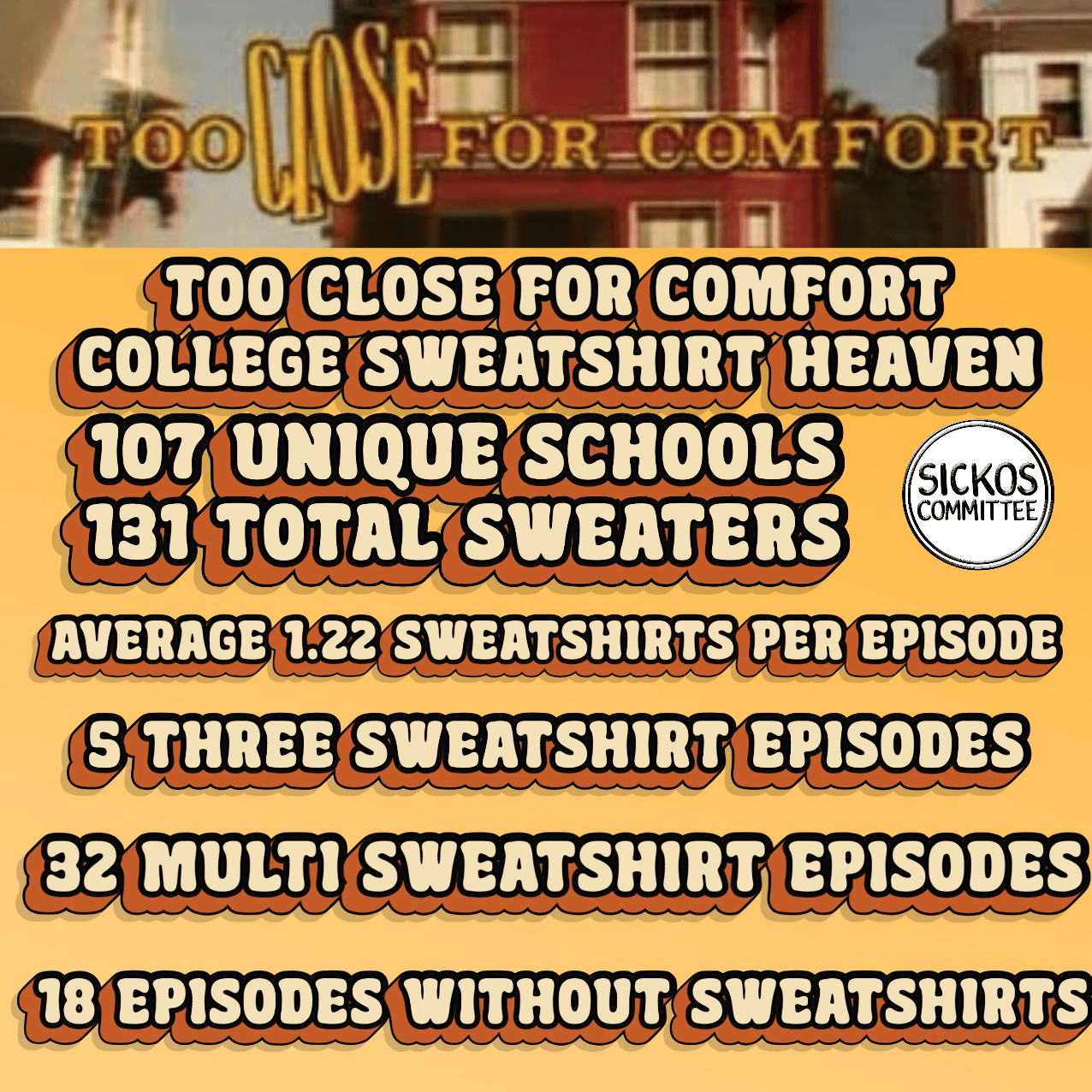 Season 3 Stats - We averaged a whopping 1.65 different sweatshirts per episode if we count episode one as just a two-parter. If we don't, it’s still a 1.58 sweatshirt per episode average. Incredible work by Ted Knight and the crew to go through all the sweatshirts. We had our first Canadian university entry here. Also, we had three episodes with three different sweatshirts in a single episode. We had 12 multi-sweatshirt episodes in this season. Half or OVER half of the season, Ted had on multiple sweatshirts in an episode. There were only two episodes where he didn’t wear one this season. Just a legendary run of sweatshirts here, and it was at its sweatshirt peak, but ABC was like, we're going to cancel the show.
