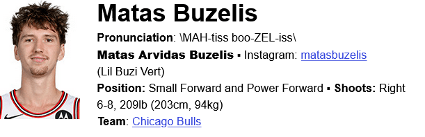The Pope getting a Bulls jersey is basically a given here. A Chicago sports team is automatically going to show up here. The #14 makes me remember Craig Hodges from the first Bulls three-peat. The current wearer of #14 is Matas Buzelis, whose apparent nickname is “Lil Buzi Vert.”