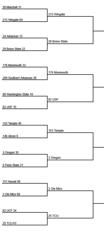 Bracket 4 out of 4, WINGATE DOES IT AGAIN!! James Franklin can’t get it done again against a Top 5 team. Damn, Temple crushed Akron in the Sickos Special.