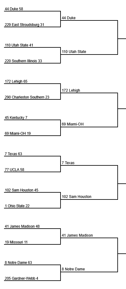 Bracket 1 of 4, MY GOD SAM HOUSTON HAS DONE IT!!! THEY TOOK OUT OHIO STATE OH MY GOD!! Lehigh has taken out our lowest seed left. We salute you Charleston Southern!