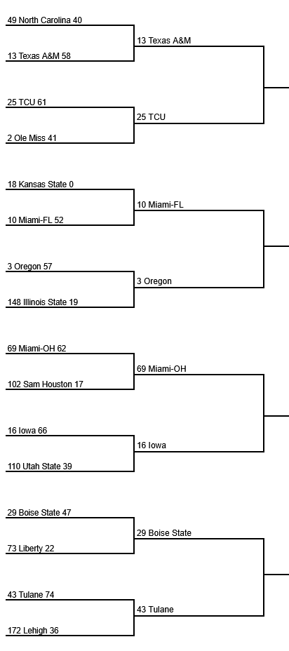 Bracket 1 of 2, THE Sam Houston State falls after their big upset. Upsets are few and far between.